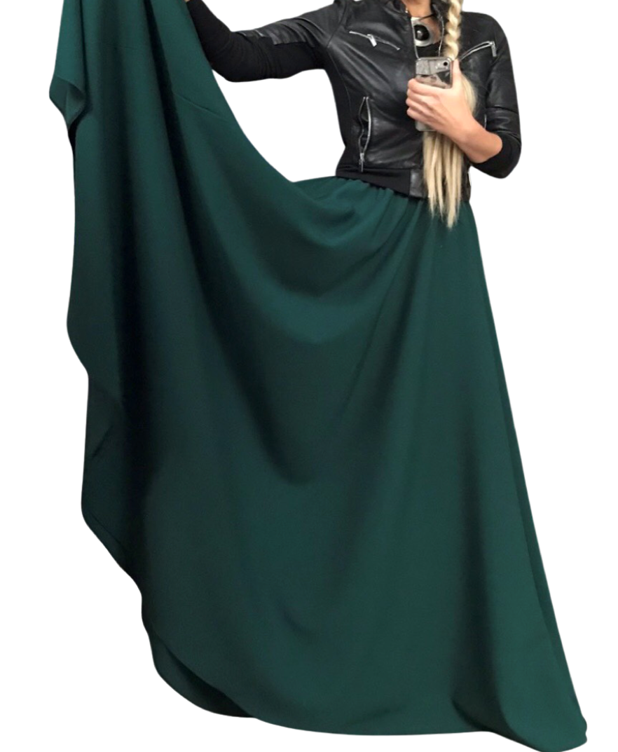 LUXUSNÍ DLOUHÁ SUKNĚ , objemná, krásná a luxusního vzhledu pro každé roční období i pro každou příležitost v elegantní tmavě zelené barvě ! Opravdu nepřehlédnutelná, elegantní i sexy. Pro běžné nošení i pro společenské události - záleží jen na vás, jak ji zrovna budete chtít vzít. Ideální pro běžné nošení s krátkou bundou a v kombinaci s černou či bílou.
