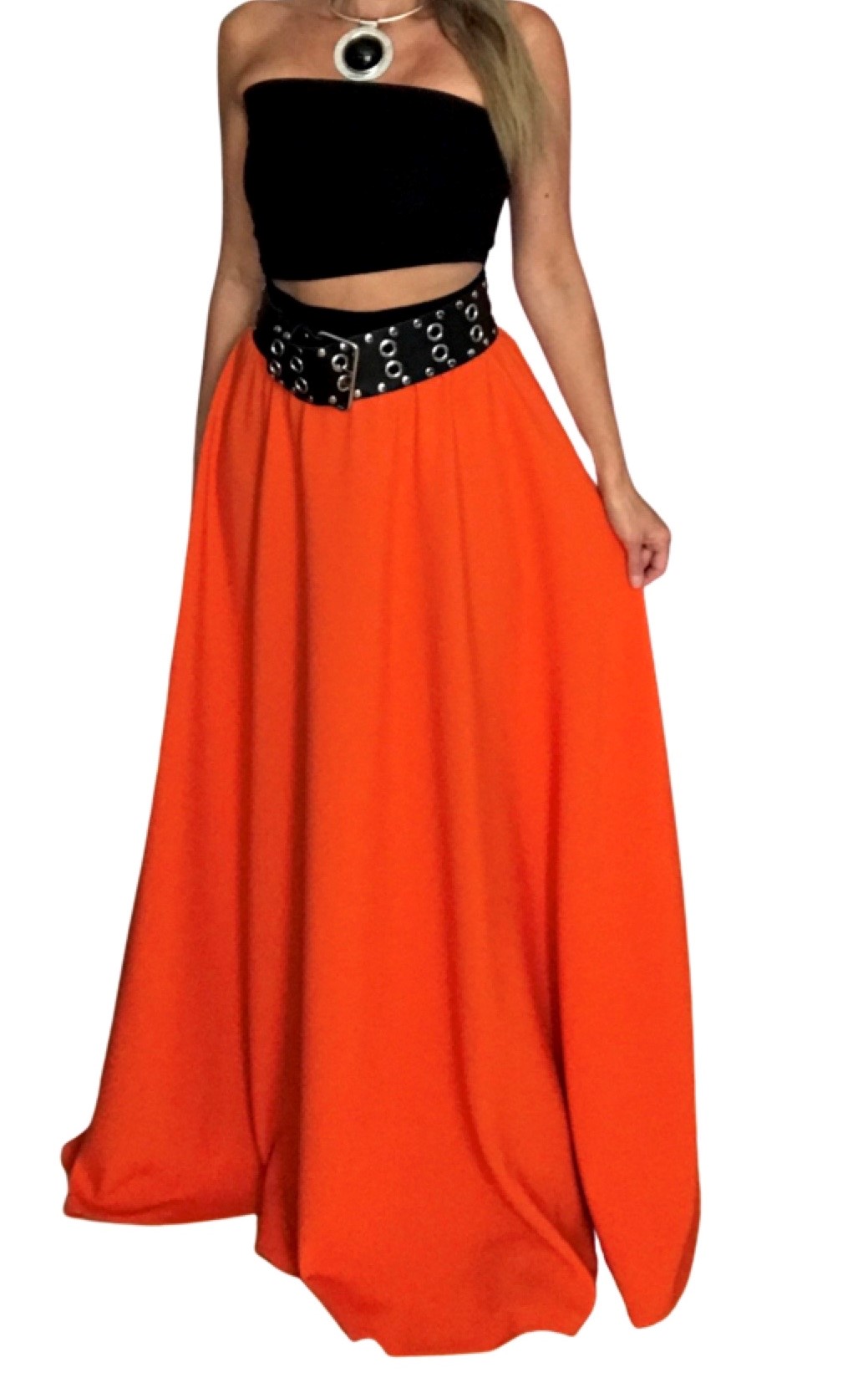 DLOUHÁ SUKNĚ krásného vzhledu v 1/2 kolovém střihu (na jaro, na léto i do společnosti) ve výrazné oranžové barvě, ve které budete nepřehlédnutelná !