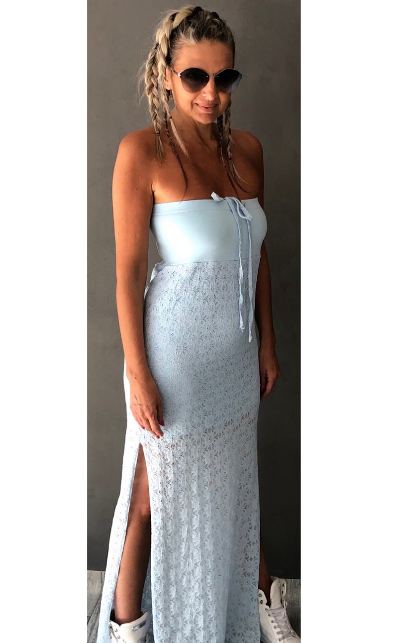 Luxusní dlouhé šaty v krásné světle modré barvě, z velmi příjemné krajky