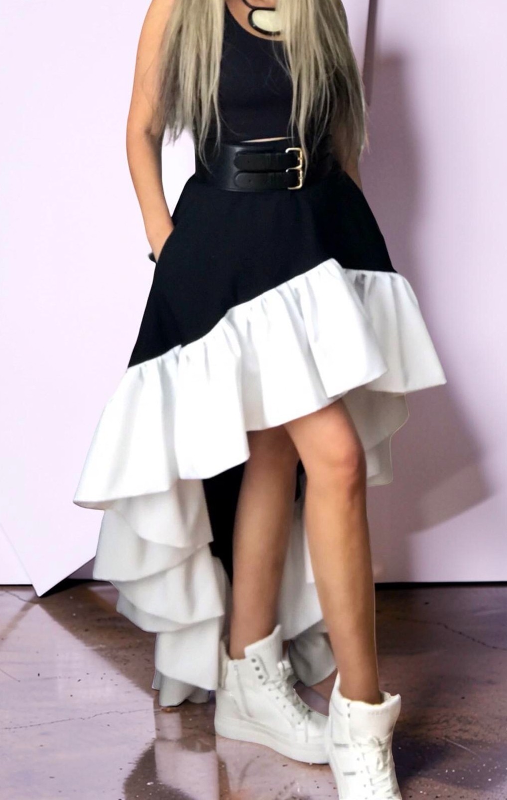 Designová luxusní sukně s volány v krásné černo-bílé kombinace. V předu kratší, zadní část dlouhá. Vhodná pro každou příležitost, k teniskám i lodičkám. Kombinovatená se všemi druhy a barvami topů. Ideální pro velikost S-L (po dohodě i větší velikosti). Upravujeme zdarma na míru dle typu postavy. celý popis