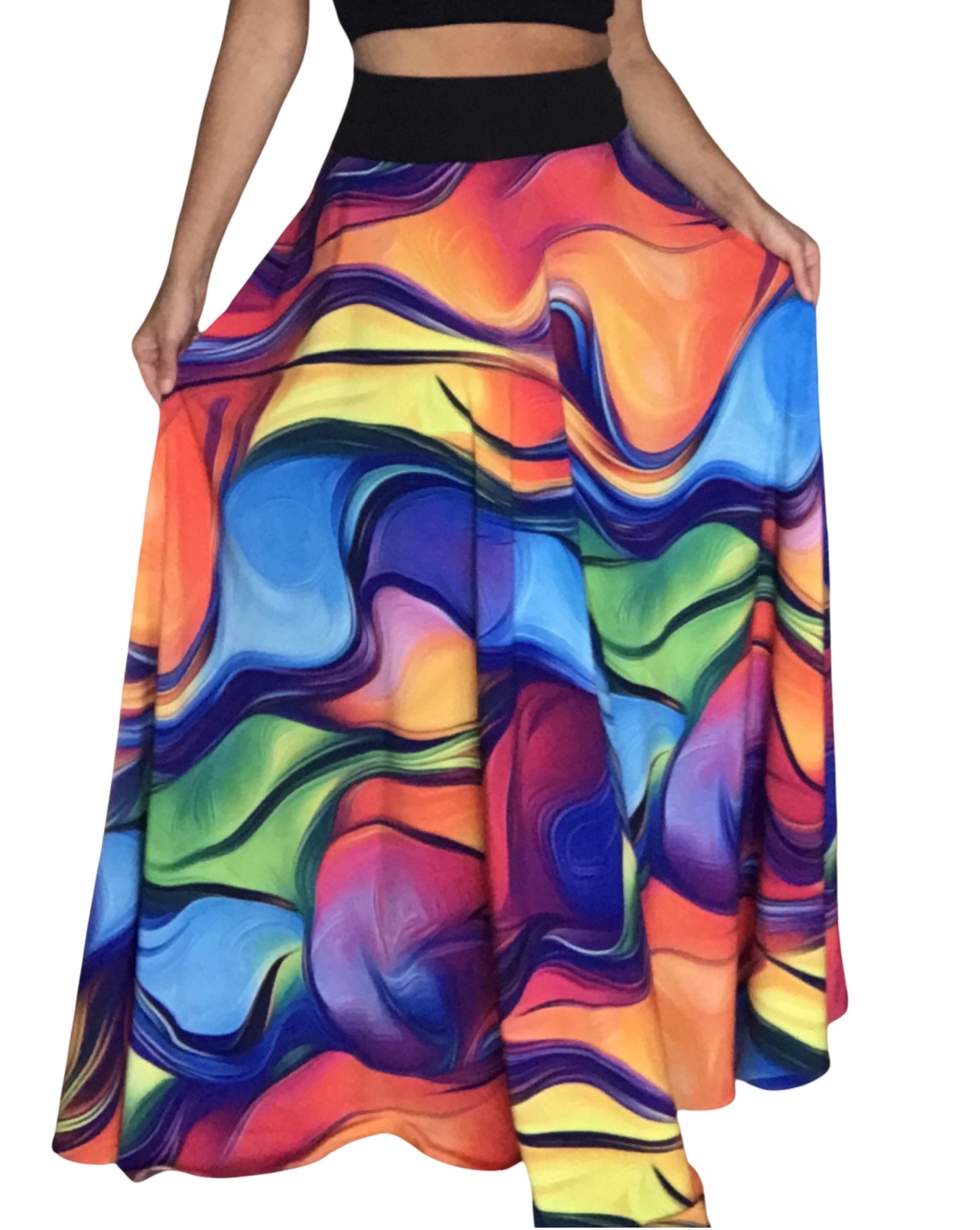 DLOUHÁ LETNÍ SUKNĚ LUXUSNÍHO VZHLEDU - maxi sukně v jemného umělého hedvábí v nádherném netradičním a naprosto originálním barevném potisku. Sukně je bez podšívky, z lehoučkého umělého hedvábí, s kvalitním potiskem a je velmi příjemná na dotek a nošení. Je vhodná i do nejteplejších dnů, pro každou příležitost, kombinovatelná zejméne s bílou, černou, a celou barevnou škálou. Látká je vzdušná. Opravdu nepřehlédnutelná a jedinečná !! Velmi výstřední a originální. Vezmete ji kamkoliv - záleží jen na vás, jak ji zrovna budete chtít vzít. Ideální pro běžné nošení s krátkou bundou, tričkem, tílkem. Nádherné syté letní barvy.