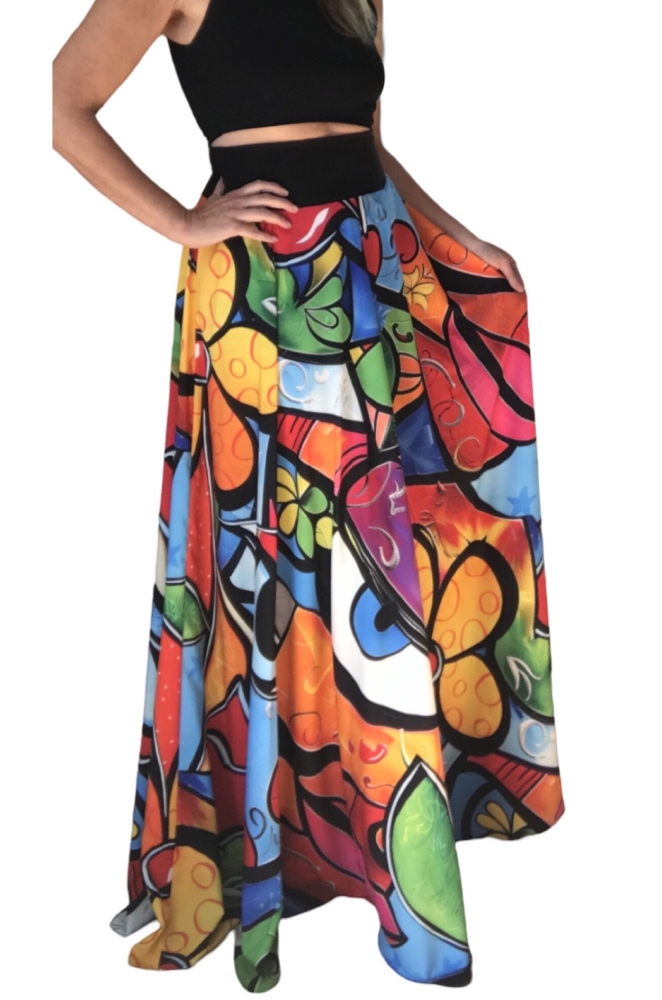 DLOUHÁ LETNÍ SUKNĚ LUXUSNÍHO VZHLEDU - maxi sukně v jemného umělého hedvábí v nádherném netradičním a naprosto originálním barevném potisku.   Sukně je bez podšívky, z lehoučkého umělého hedvábí, s kvalitním potiskem a je velmi příjemná na dotek a nošení.  Je vhodná i do nejteplejších dnů, pro každou příležitost, kombinovatelná zejméne s bílou, černou, a celou barevnou škálou.  Látká je vzdušná. Opravdu nepřehlédnutelná a jedinečná !! Velmi výstřední a originální. Vezmete ji kamkoliv - záleží jen na vás, jak ji zrovna budete chtít vzít. Ideální pro běžné nošení s krátkou bundou, tričkem, tílkem.