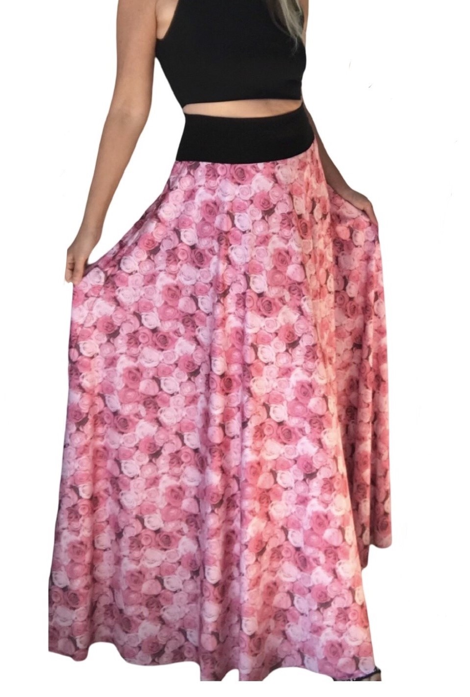 DLOUHÁ LETNÍ SUKNĚ - maxi sukně z krásného pružného a hladkého úpletu podobného plavkovině s krásným potiskem jemných růžových růžiček. Sukně je vhodná pro každou příležitost. Působí jemně, žensky a romanticky. Sukně je z nemačkavého materiálu, tedy ideální na dovoelnou, na cestování, do kanceláře, prostě kamkoliv ... Je v půlkolovém střihu, splývavá, spíše neřasená, položí se na bocích.