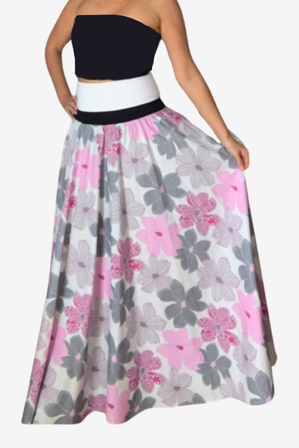 DLOUHÁ LETNÍ SUKNĚ krásná a jemné s velkými květy v 1/2 kolovém střihu (na jaro, na léto) v jemné kombinaci šedé, růžové a bílé.