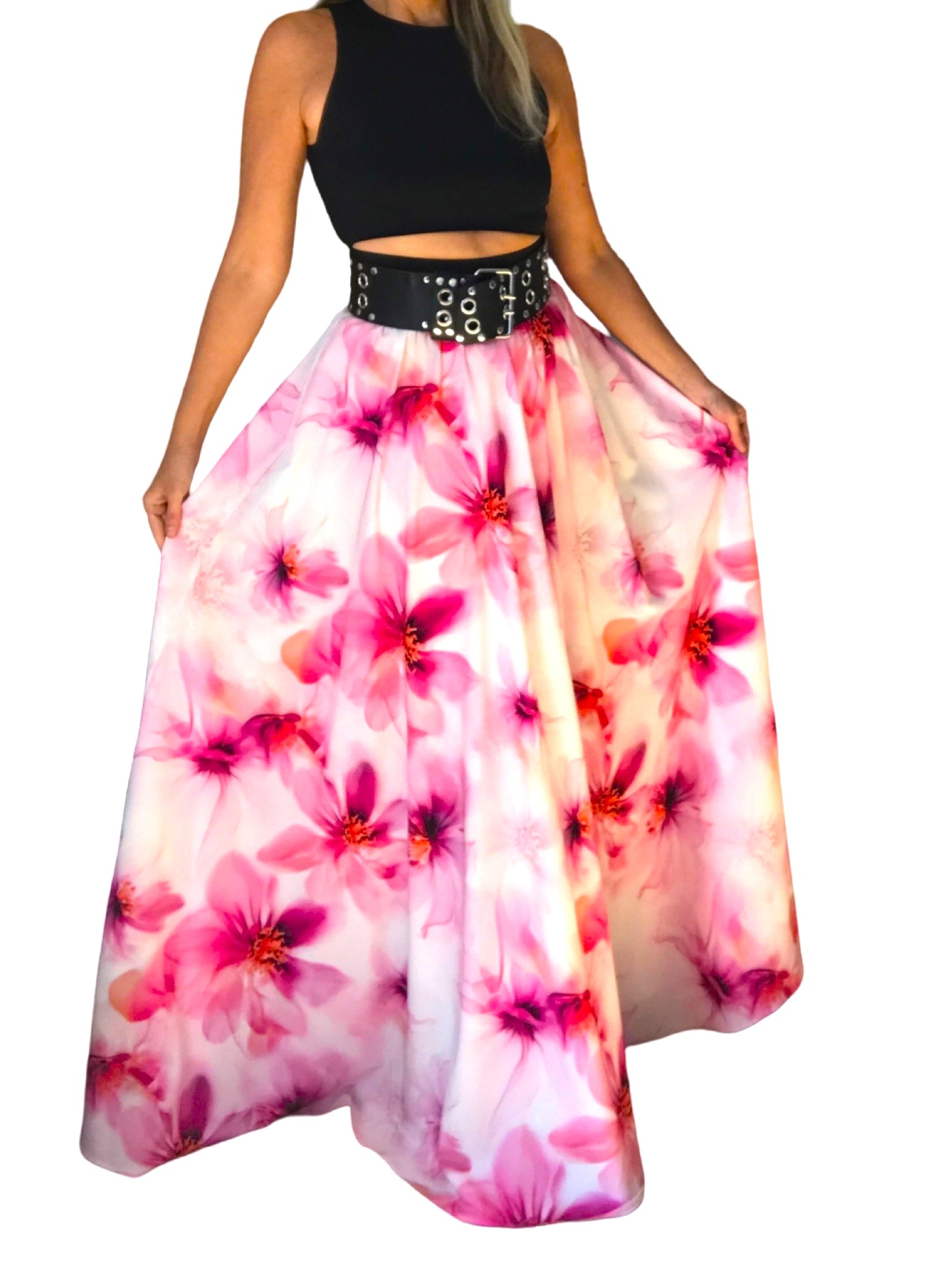 DLOUHÁ LETNÍ SUKNĚ luxusního vzhledu v 1/2 kolovém střihu (na jaro, na léto) v nádherném barevném provedení z velkých pestrých květů v odstínech od světle růžové do tmavě cyklamenová. PROSTĚ NÁDHERNÁ ! LETNÍ, ÚŽASNÁ, VÝRAZNÁ, NEPŘEHLÉDNUTELNÁ ! Z lehké šatovky - umělé hedvábí, tedy vzdušná a vhodn i do horkých dnů. Velmi rychle - ideální na dovolenou.
