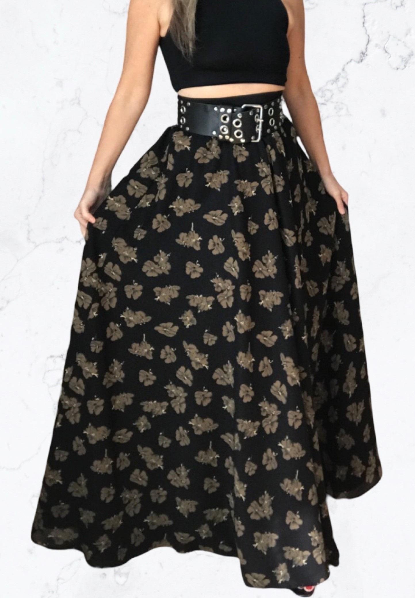 DLOUHÁ LETNÍ SUKNĚ  - maxi sukně z černého šifonu s potiskem hnědých květů.  Sukně je s lehoučkou podšívkou, neboť se jedná o velmi lehký a průsvitný materiál - šifon. Látká je hladká, klouzavá, super vzdušná. Sukně je vhodná pro každou příležitost. Ideální pro letní období do horkých dnů a na dovolenou. Kombinovatelná téměř se všemi letními pastelovými barvami a samozřejmě bílou/černou.  Cítíte se v ní opravdu jako dáma a princezna v jednom. Krásně se nosí, je lehká a vzdušná.  Vhodná jak pro běžné nošení, tak i pro společenské události - záleží jen na vás, jak ji zrovna budete chtít vzít. Ideální pro běžné nošení s krátkou bundou, tričkem, tílkem, či svátečním topem.