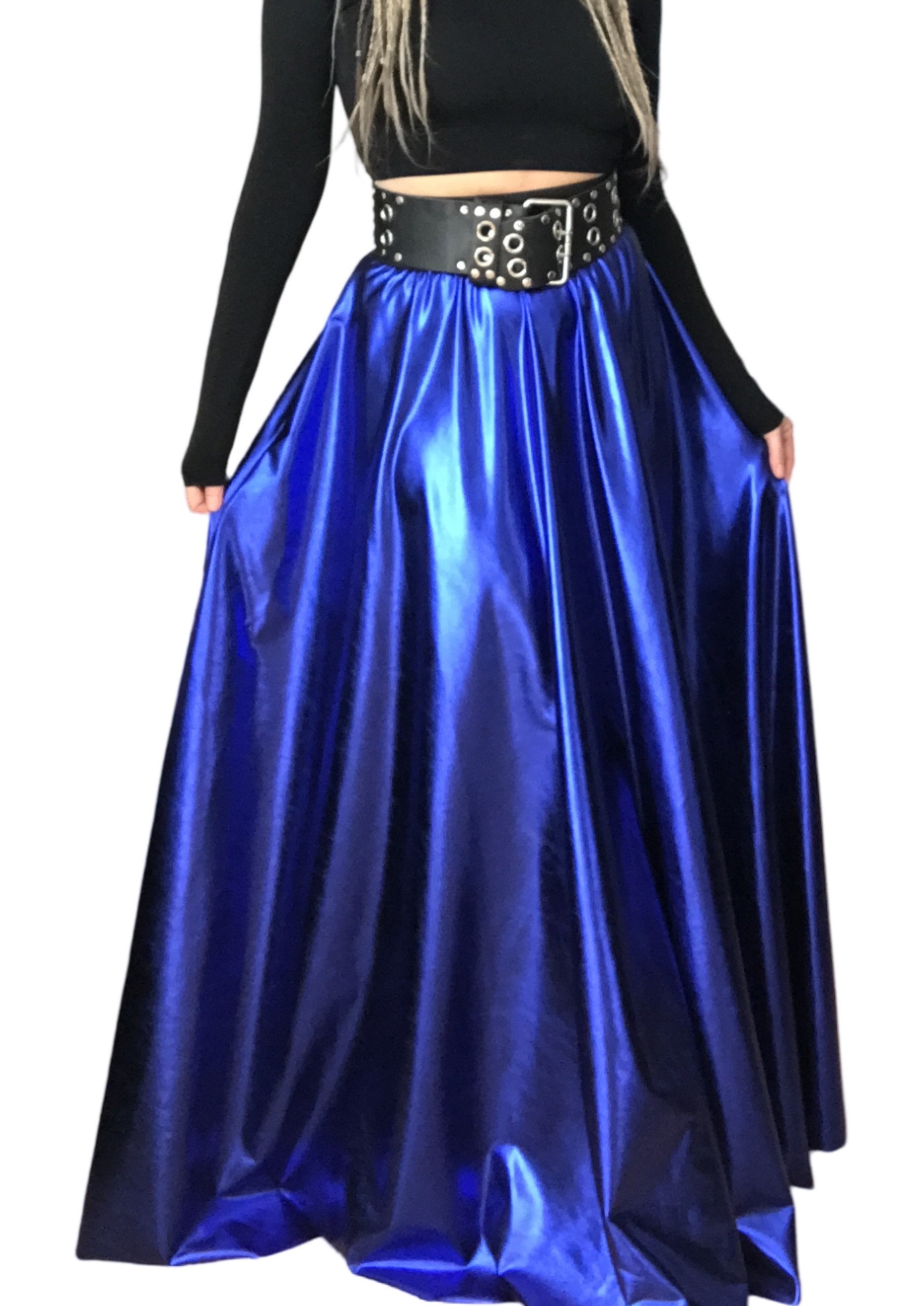 DLOUHÁ SPOLEČENSKÁ SUKNĚ LUXUSNÍHO VZHLEDU - maxi sukně v krásné modré barvě z lesklého materiálu, NEPŘEHLÉDNUTELNÁ. Sukně je vhodná na společenské události. Látká je splývavá, mírně pružná