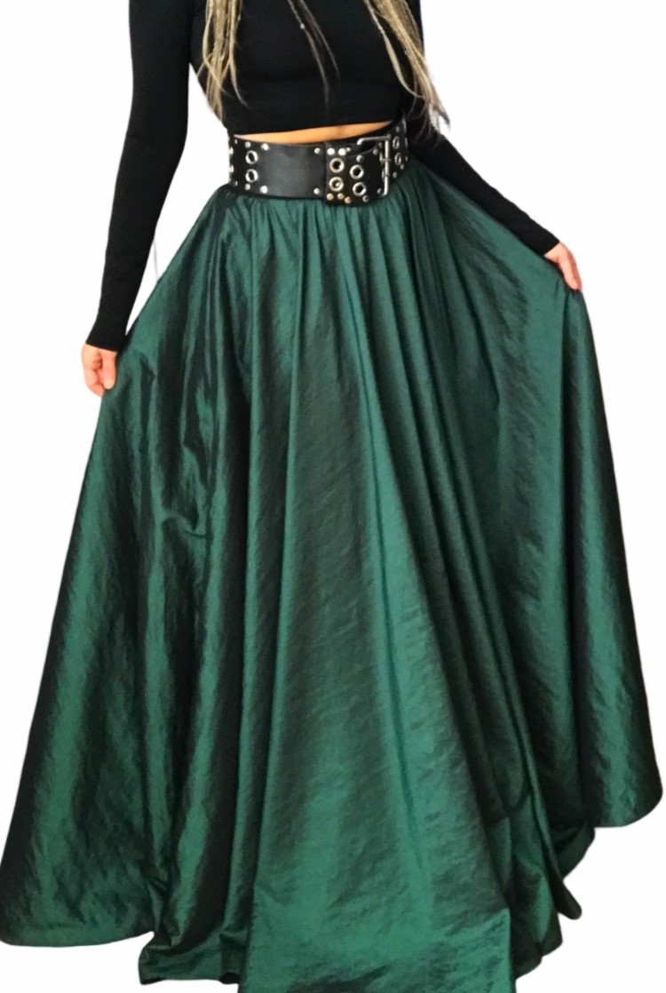 Dlouhá společenská sukně luxusního vzhledu v zelené barvě z mírně krešovaného (mačkaného) taftu. Bohatá, kolový stiřh, pružný pas na širokou gumu, možnost bočních kapes a úprava na míru zdarma. celý popis