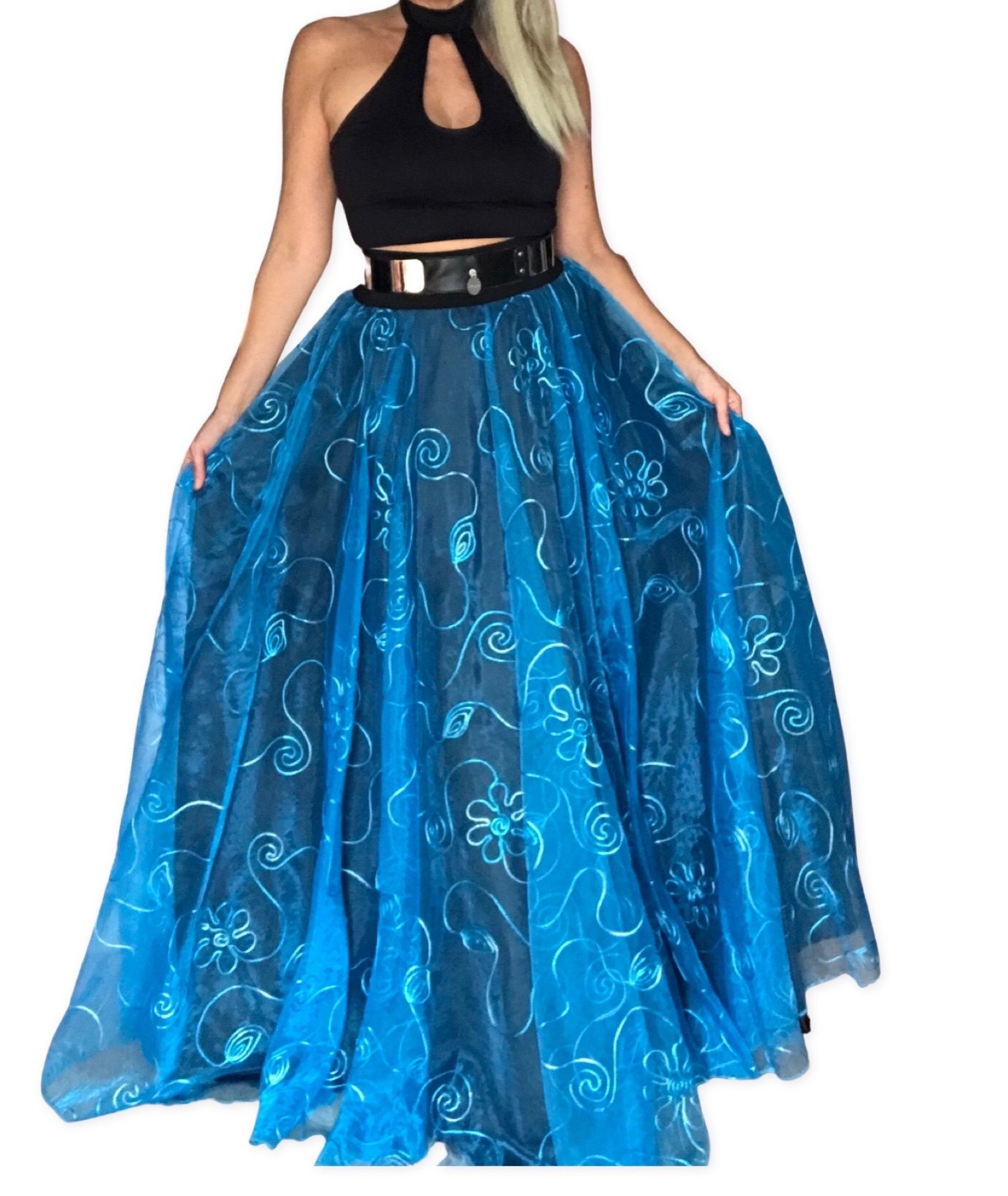 LUXUSNÍ DLOUHÁ SPOLEČENSKÁ SUKNĚ velkého objemu, plnokolová, bohatá a opravdu krásná do společnosti z lehké nádherné modré organzy s výšivkou na černém podkladu.