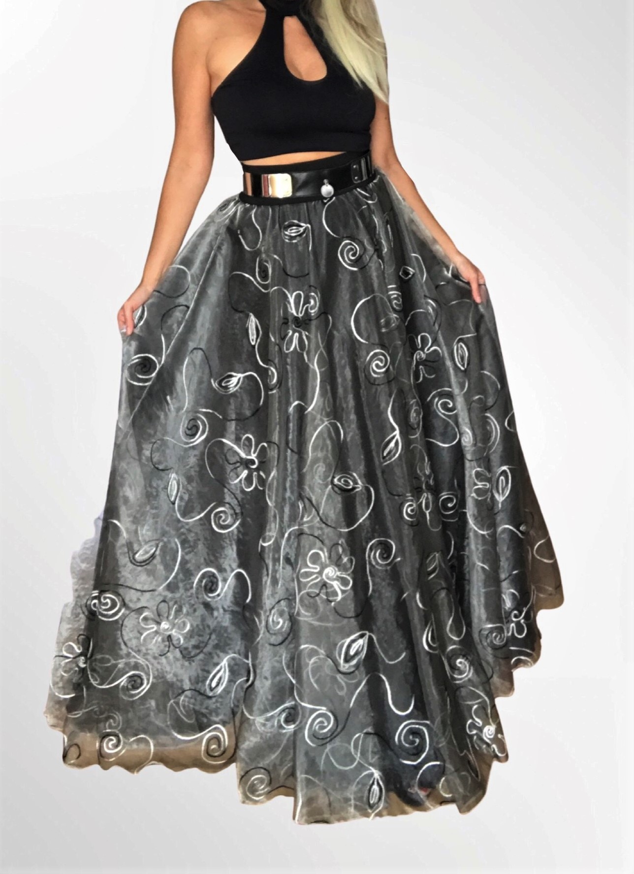 Ideální ke kombinaci s černým/ bílým / stříbrným topem. Sukně je kolové střihu, tedy objemná, bohatá (dolní obvod dle výšky postavy přes 8 m)