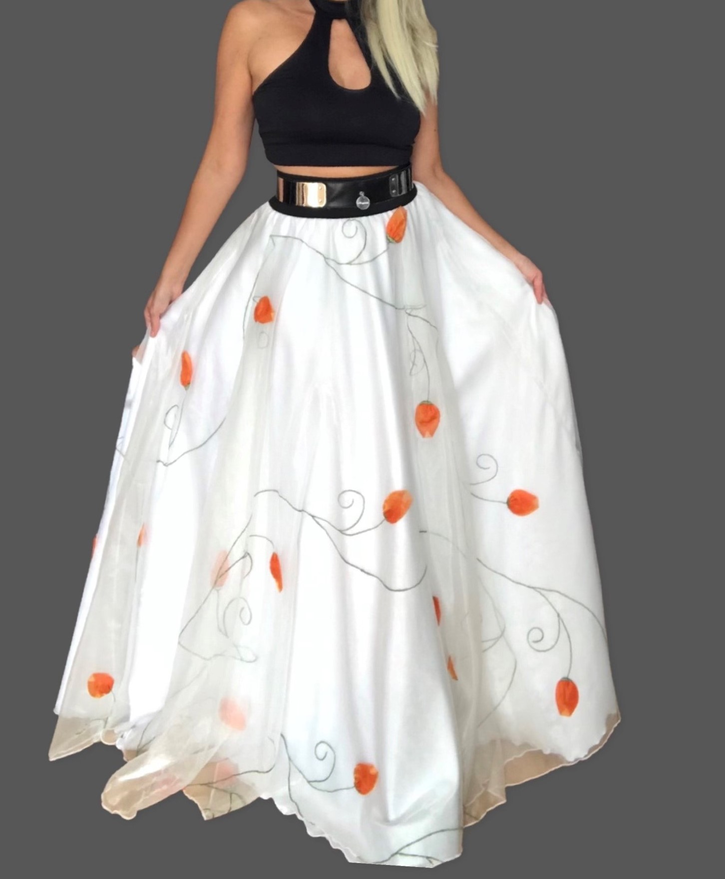 LUXUSNÍ DLOUHÁ SPOLEČENSKÁ SUKNĚ velkého objemu, plnokolová, bohatá a opravdu krásná do společnosti z lehké nádherné sněhově bílé organzy s velkými oranžovými květy (podšívka v barvě).