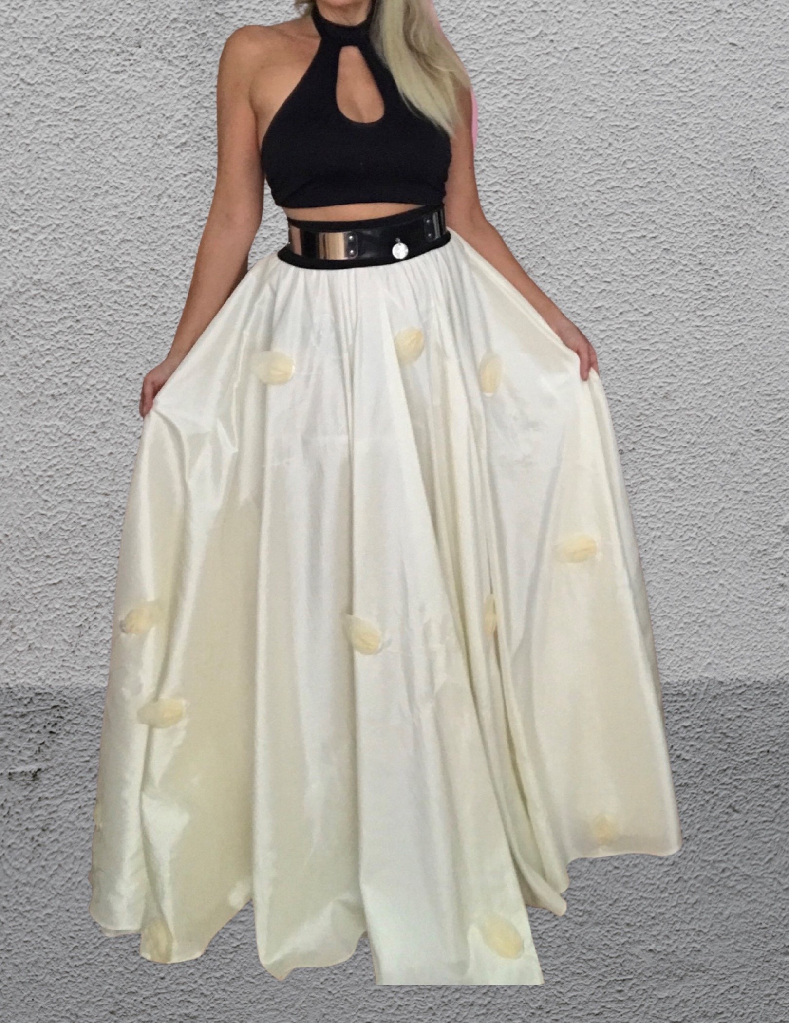 LUXUSNÍ DLOUHÁ SPOLEČENSKÁ SUKNĚ velkého objemu, plnokolová, bohatá a opravdu krásná do společnosti z taftu v krémové barvě s velkými květy tvaru tulipánu. Vhodná i jako maturitní sukně či svatební sukně.