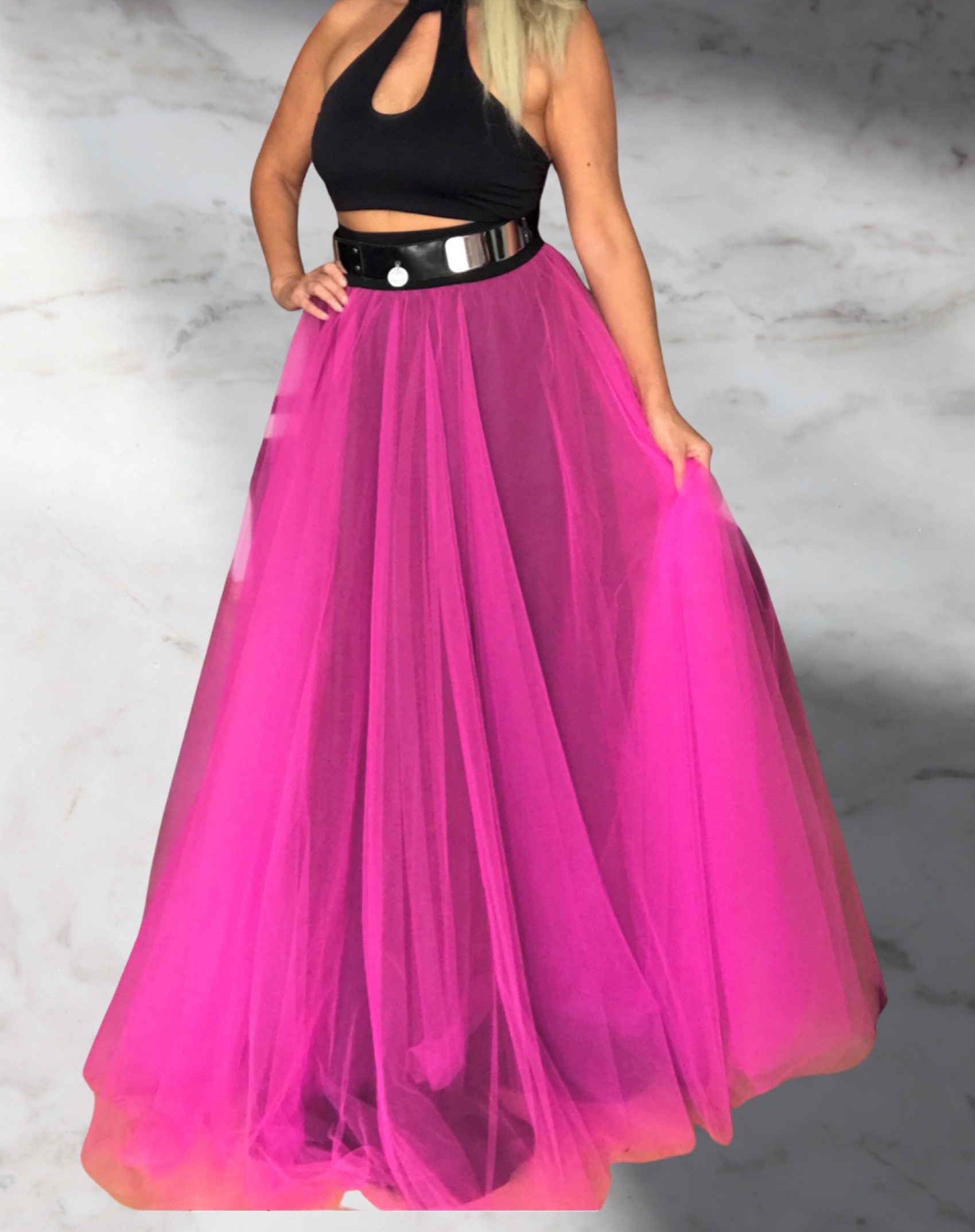 OPRAVDU JEDINEČNÝ KOUSEK . Jedná se o tyl výrazné barvy (růžová s nádechem do fialova v neonovém tonu). Vhodná do společnosti, krásná s tylovou spdnicí, ale i bez ní působí bohatě. Možno vzít i jako maturitní.