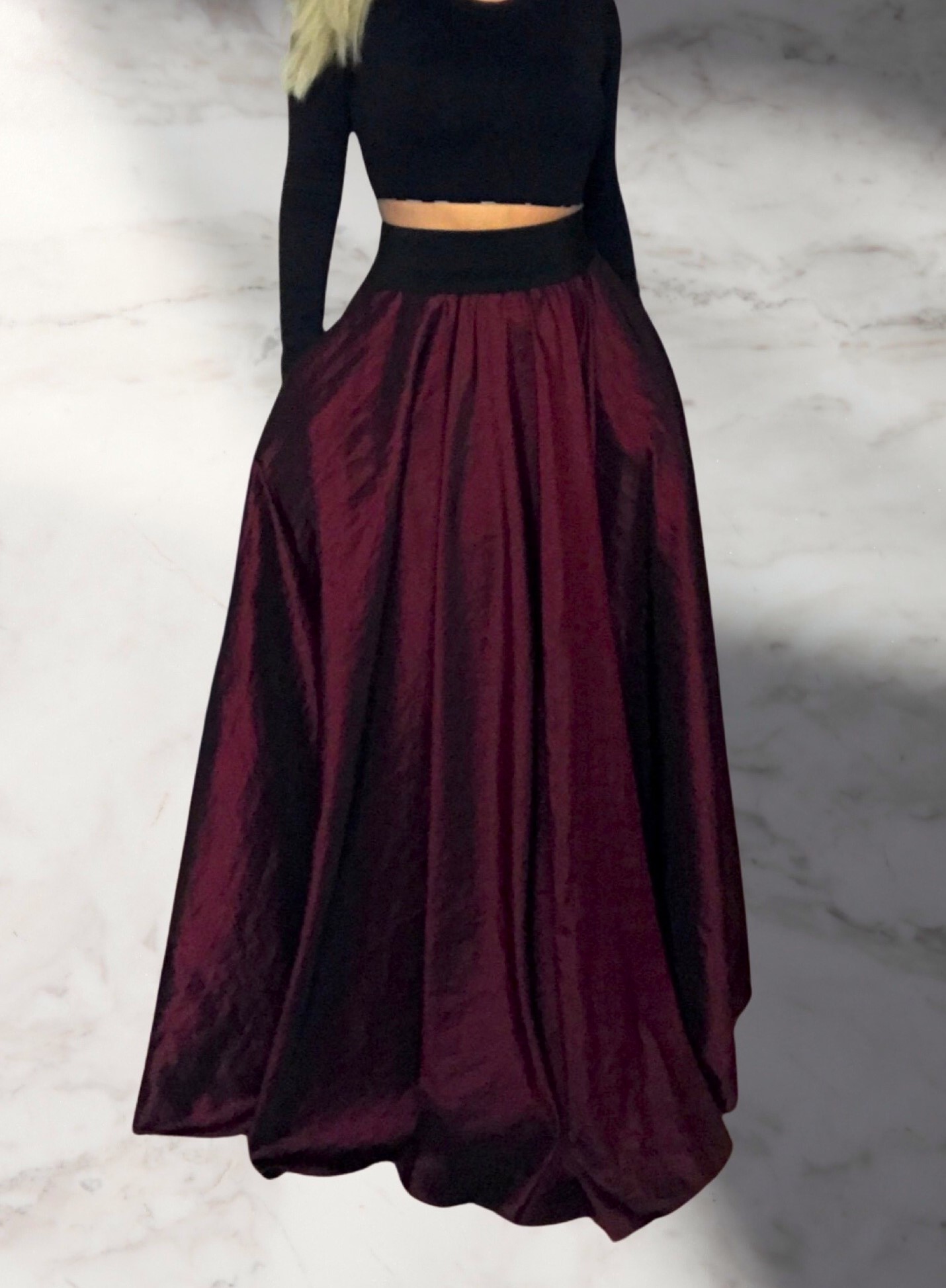 LUXUSNÍ DLOUHÁ SUKNĚ velkého objemu, plnokolová, bohatá a opravdu krásná v krásné elegantní vínové barvě. OPRAVDU JEDINEČNÝ KOUSEK s mírným leskem.  Jedná se o taft (laicky vzhledu společenského šusťáku - tradiční na plesové šaty a sukně). Vhodná jak do společnosti, pro trochu odvážnější z vás... celý popis