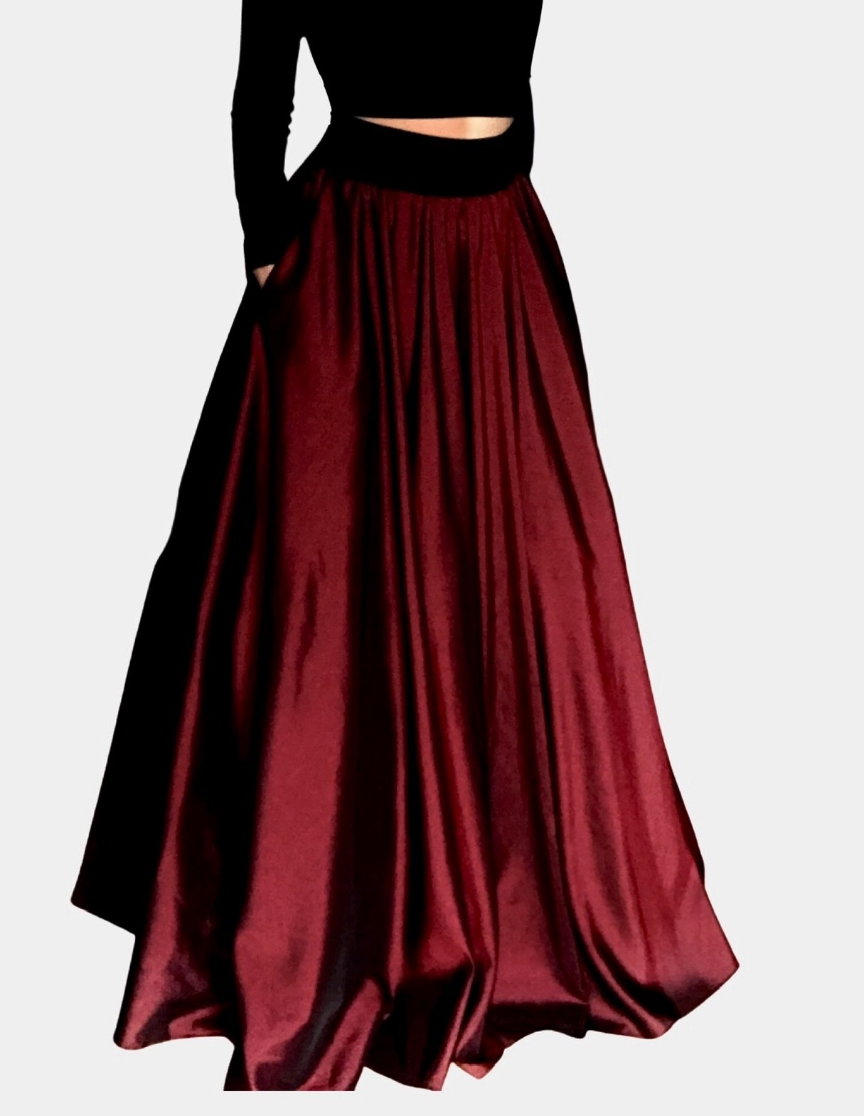 LUXUSNÍ DLOUHÁ SUKNĚ velkého objemu, plnokolová, bohatá a opravdu krásná v krásné elegantní tmavě červené barvě s mirně černým nádechem. OPRAVDU JEDINEČNÝ KOUSEK s mírným leskem.  Jedná se o taft (laicky vzhledu společenského šusťáku - tradiční na plesové šaty a sukně). Vhodná jak do společnosti... celý popis