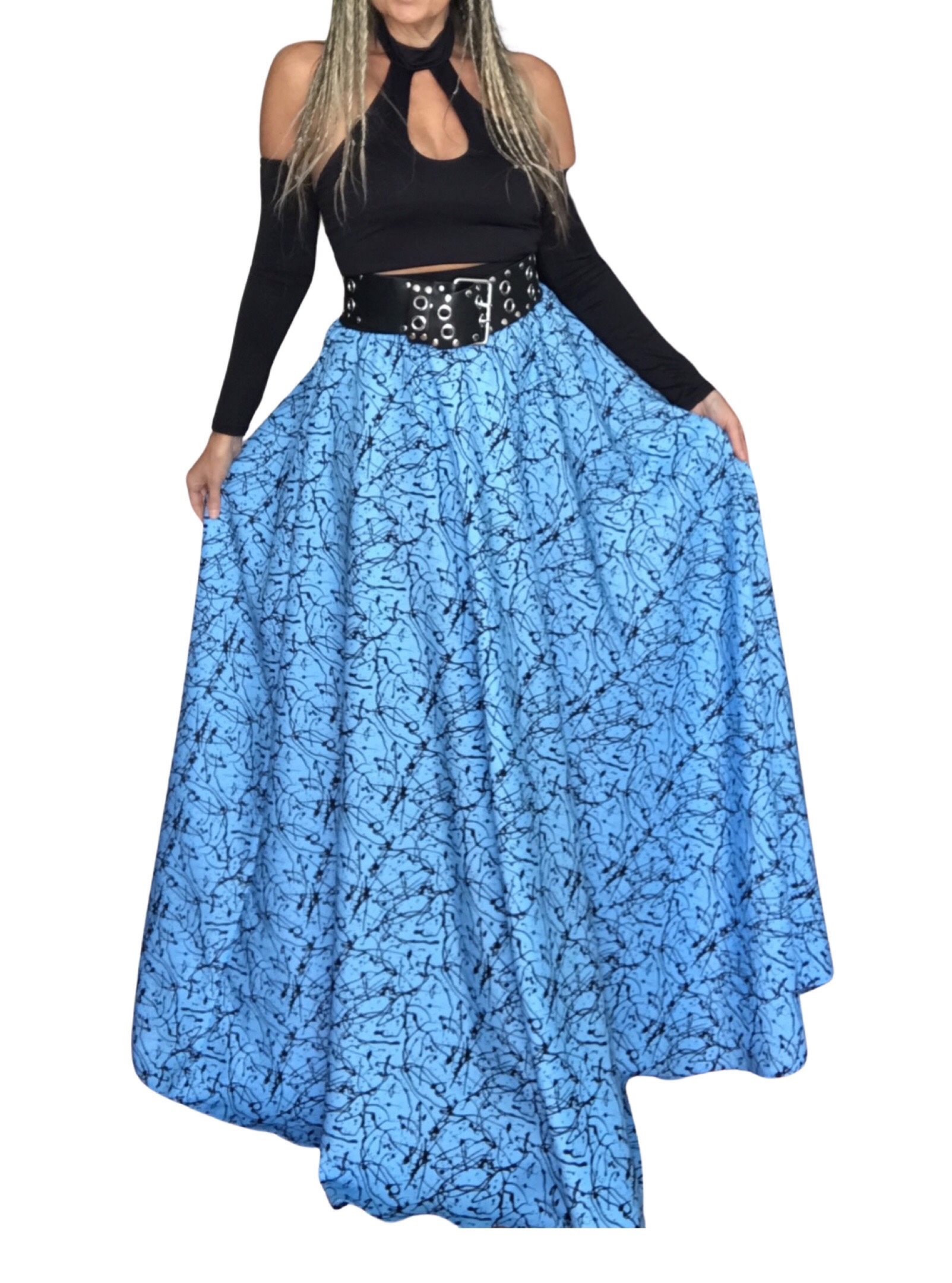DLOUHÁ  SUKNĚ - maxi sukně, LUXUSNÍ DLOUHÁ SUKNĚ v krásné VÝRAZNÉ  světlé modré barvě s černými cákanci. KRÁSNÁ, ELEGANTNÍ A LUXUSNÍ,  pro každé roční období i pro každou příležitost v zajímavém a netradičním potisku, kombinovatelná zejméne s bílou, černou a letními barvami a jakýmkoliv druhem horního topu.  Opravdu nepřehlédnutelná a jedinečná !! Velmi elegantní i sexy. Pro  běžné nošení i pro společenské události - záleží jen na vás, jak ji zrovna budete chtít vzít. Ideální pro běžné nošení s krátkou bundou, tričkem, tílkem, či svátečním topem.