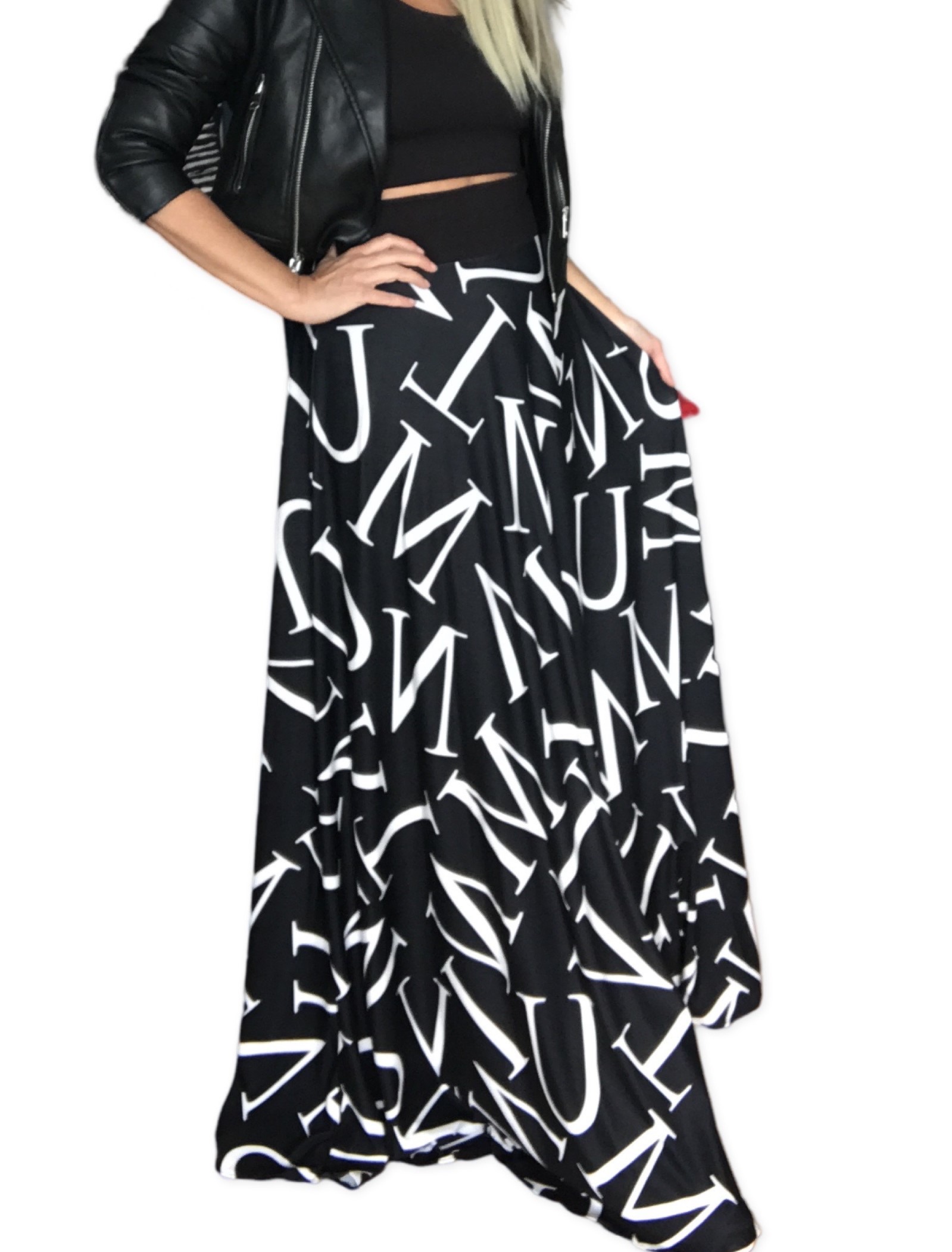 DLOUHÁ LETNÍ SUKNĚ LUXUSNÍHO VZHLEDU - maxi sukně v jemného příjemného úpletu v kombinaci černé a bílé /potisk velkých písmen. Sukně je bez podšívky, je pružná a splývavá. Je vhodná pro každou příležitost, kombinovatelná zejména s bílou, černou, a celou barevnou škálou. Látká je vzdušná. Opravdu nepřehlédnutelná a jedinečná !! Velmi výstřední a originální. Vezmete ji kamkoliv - záleží jen na vás, jak ji zrovna budete chtít vzít. Ideální pro běžné nošení s krátkou bundou, tričkem, tílkem. Focena varianta s nápletem v pase