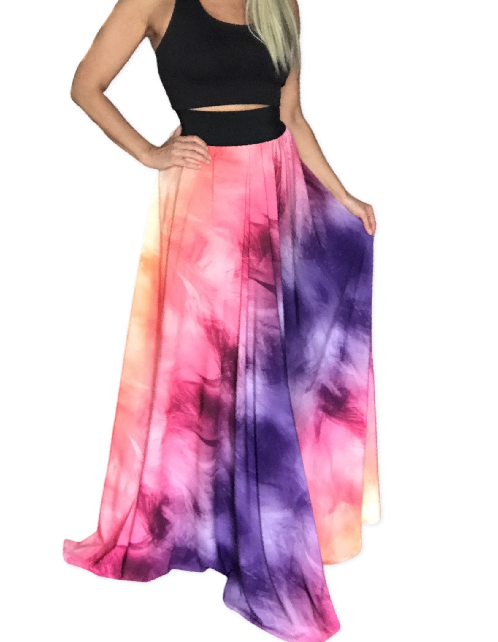 Dlouhá letní sukněĚ LUXUSNÍHO VZHLEDU - maxi sukně v jemného umělého hedvábí v nádherném netradičním a naprosto originálním barevném potisku. Sukně je bez podšívky, z lehoučkého umělého hedvábí, s kvalitním potiskem a je velmi příjemná na dotek a nošení. Je vhodná i do nejteplejších dnů, pro každou příležitost, kombinovatelná zejméne s bílou, černou, a celou barevnou škálou. Látká je vzdušná. Opravdu nepřehlédnutelná a jedinečná !! Velmi výstřední a originální. Vezmete ji kamkoliv - záleží jen na vás, jak ji zrovna budete chtít vzít. Ideální pro běžné nošení s krátkou bundou, tričkem, tílkem. Nádherné letní barvy v kombinaci fialové, růžové, oranžové