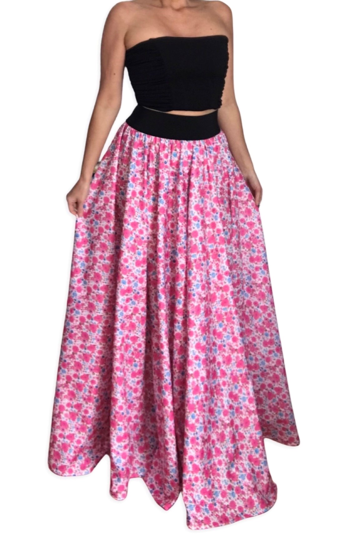 V pase pružná (přizpůsobí se) - na širokou černou gumu š.8 cm (poměrně pevná). Gumu přizpůsobujeme na míru dle typu postavy a vašeho obvodu. Variantně je možné místo gumy vsadit do pasu široký černý náplet (cca 12 cm šířky). Náplet se nosí spíše přes bříško, tedy horní hrana nápletu začíná cca v pase. Je velmi pružný, nedělá nikdy faldíky a přizpůsobuje se výkyvům váhy. Dolní obvod kolem 4 m (1/2 kolový střih). Náplet v pase je naprosto pohodlný, přizpůsobí se výkyvům váhy a nedělá žádné faldíky (náplet je materiál, který nejčastěji najdete na lemu mikin - hladký). Náplet je vhodný pro větší velikosti.