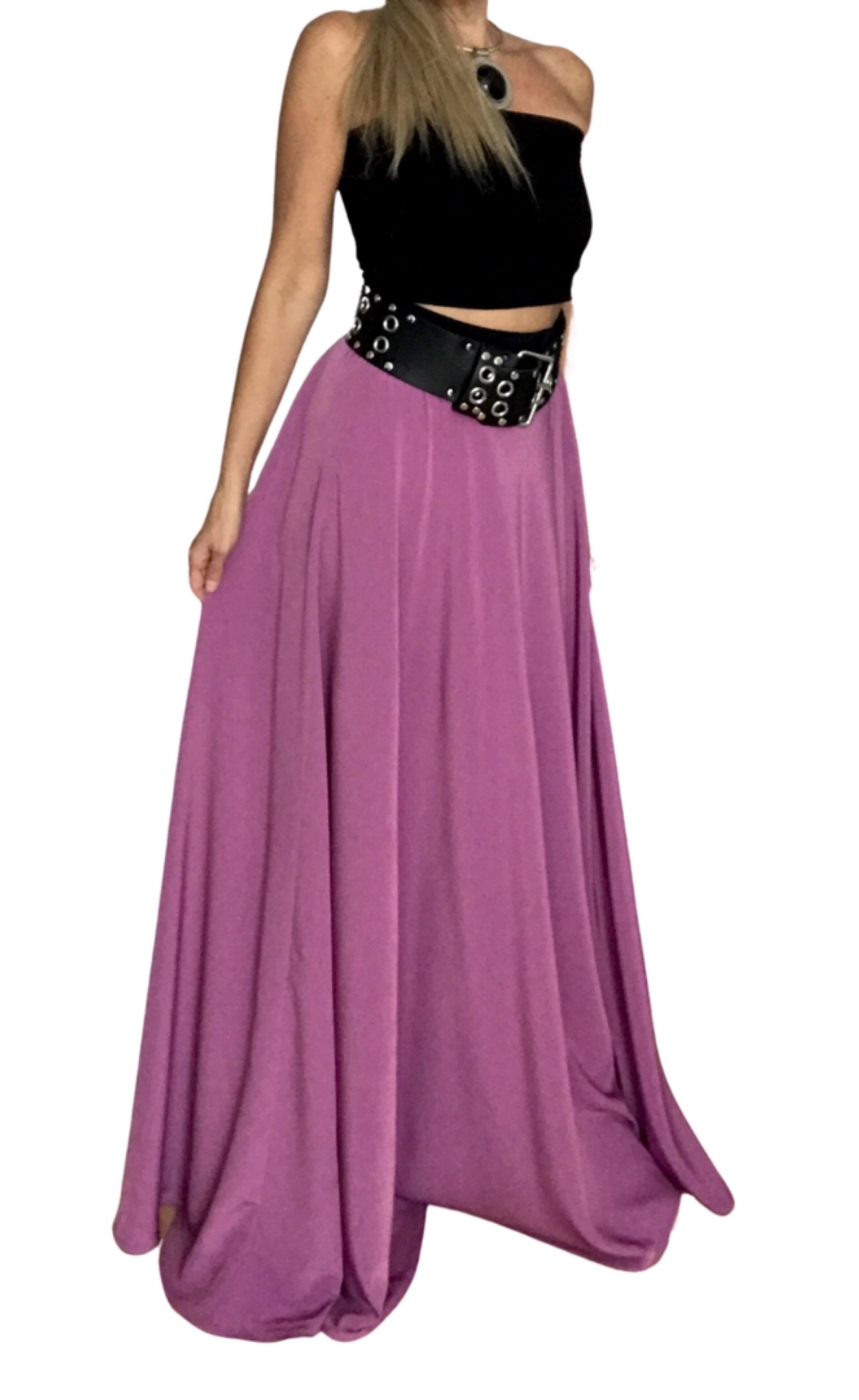 KRÁSNÁ DLOUHÁ SUKNĚ  v  jemné fialkové barvě z mírně lesklé a velmi příjemné halenkoviny v půlkolovém střihu. Působí elegantně i sexy. Kombinovatelná s čímkoliv, ideální kombinace s bílou a černou.