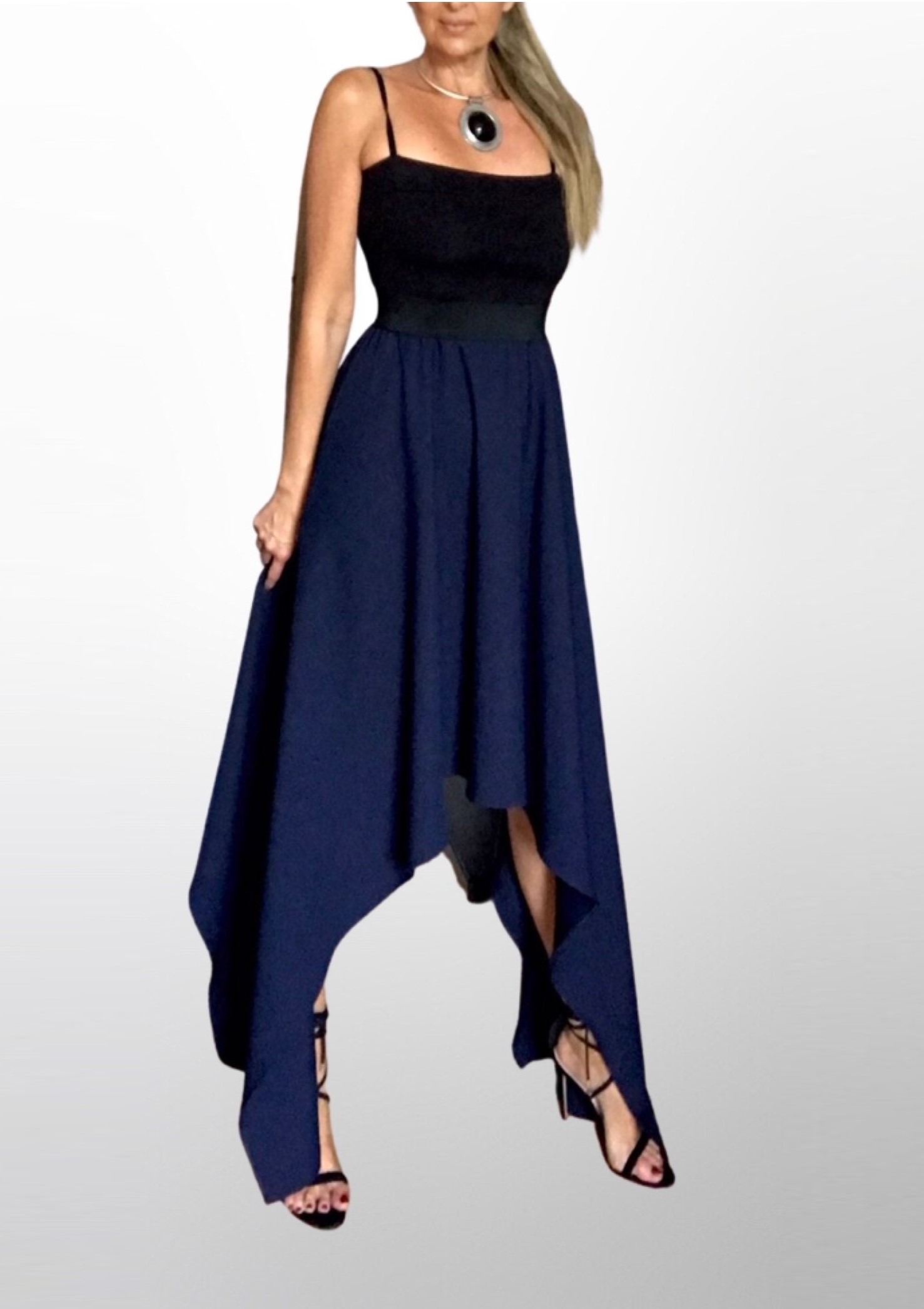 KRÁSNÉ asymetrické šaty originálního střihu v elegantní tmavě modré barvě v kombinaci s černým horním dílem. Pod prsy pružná černá guma.  Působí velmi elegantně i sexy.  Vrchní top je elastický (z dvojitého nápletu - lze nosit i bez podprsenky) na úzká ramínka.