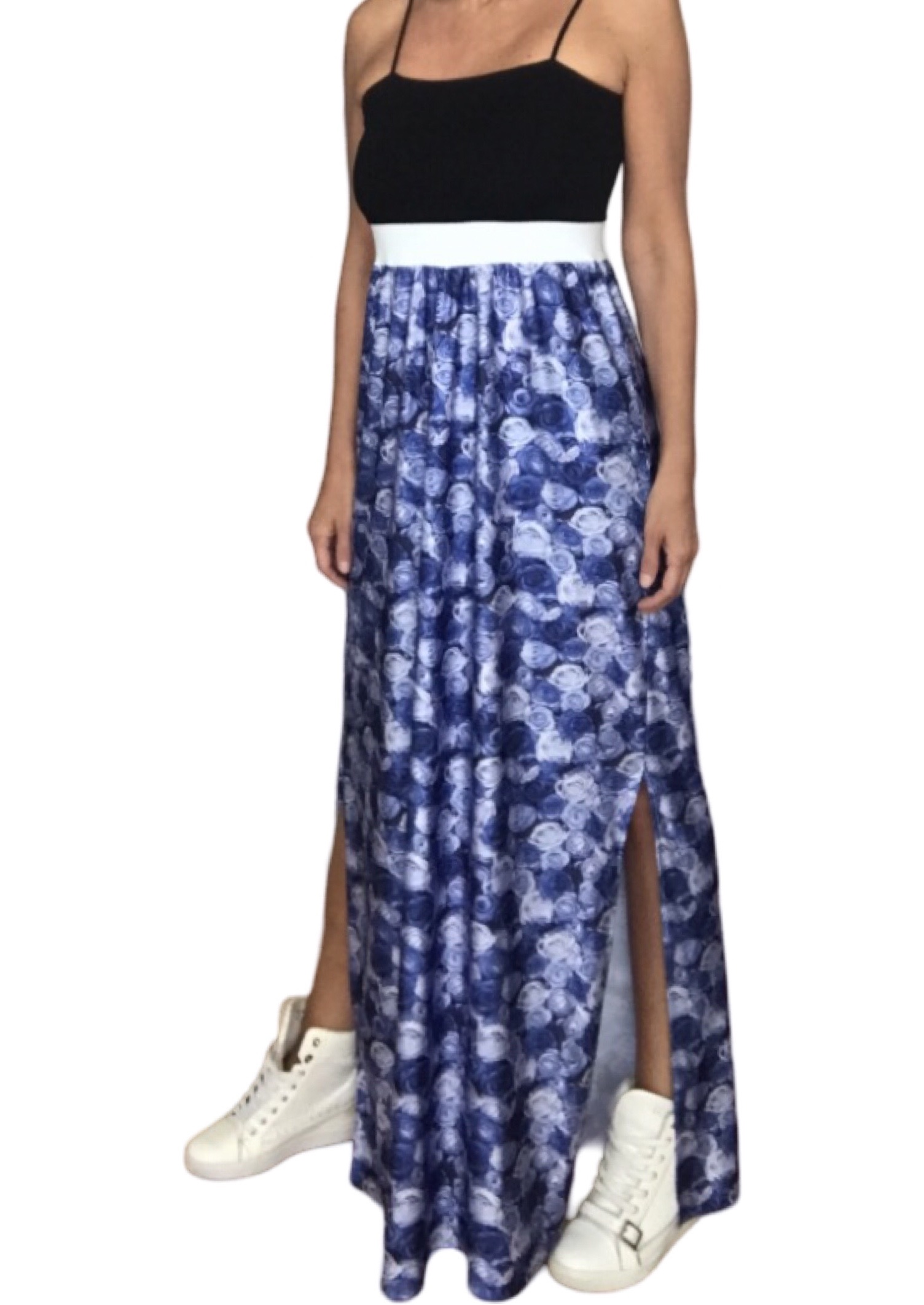 DLOUHÉ LETNÍ ŠATY  v krásném romantickém potisku modrých růžiček v kombinaci černým vrchním dílem. Krásné,  NEMAČKAVÉ - ideální na dovolenou. Jsou z polyesterového úpletu (pružné - látka typu plavkoviny), chladivé. Horní díl na ramínka z dvojitého nápletu. Horní tom se přizpůsobí velikosti prsou 85-110.