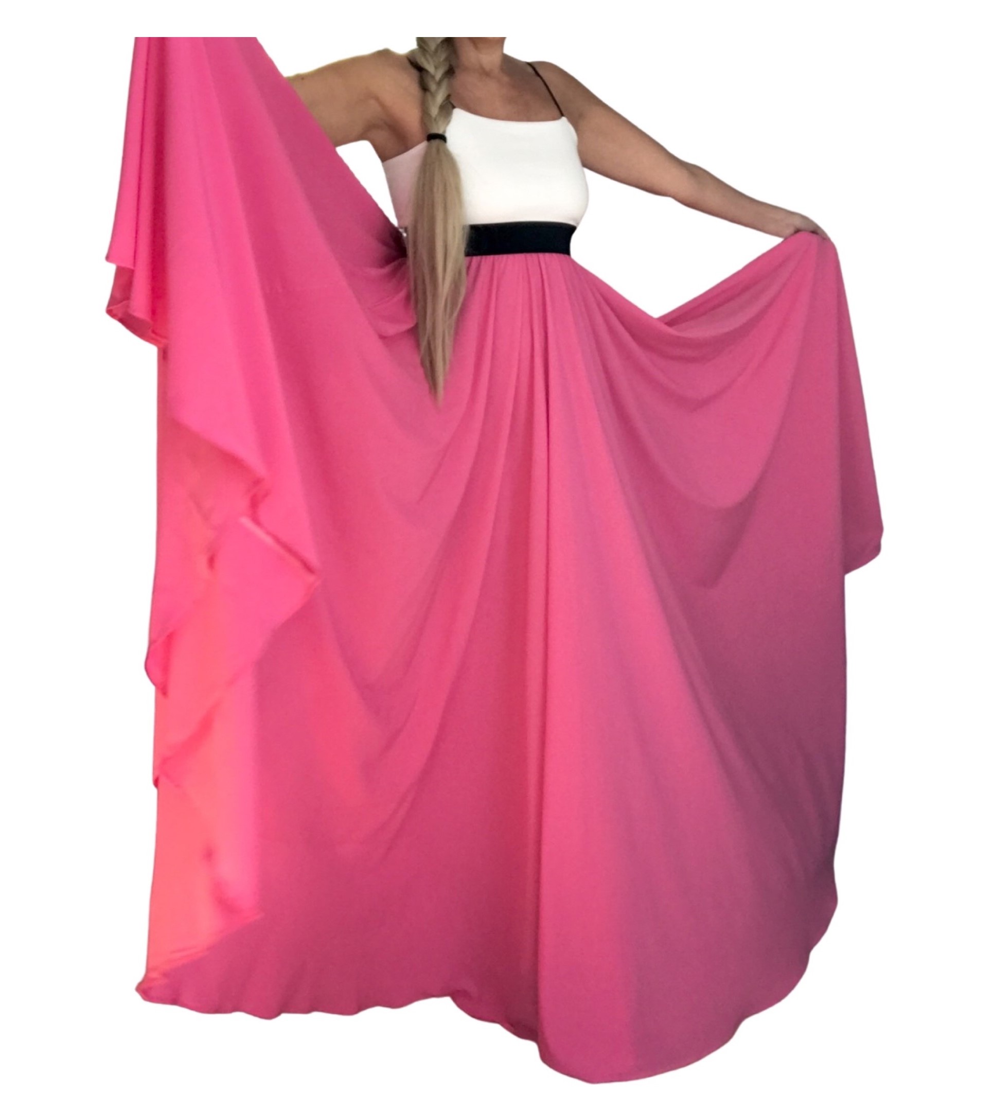 KRÁSNÉ A LUXUNÍ dlouhé šaty v nepřehlédnutelné růžové-cyklamenové barvě v kombinaci s bílým horním dílem. Šaty jsou z umělého hedvábí, velice lehké, jemné.