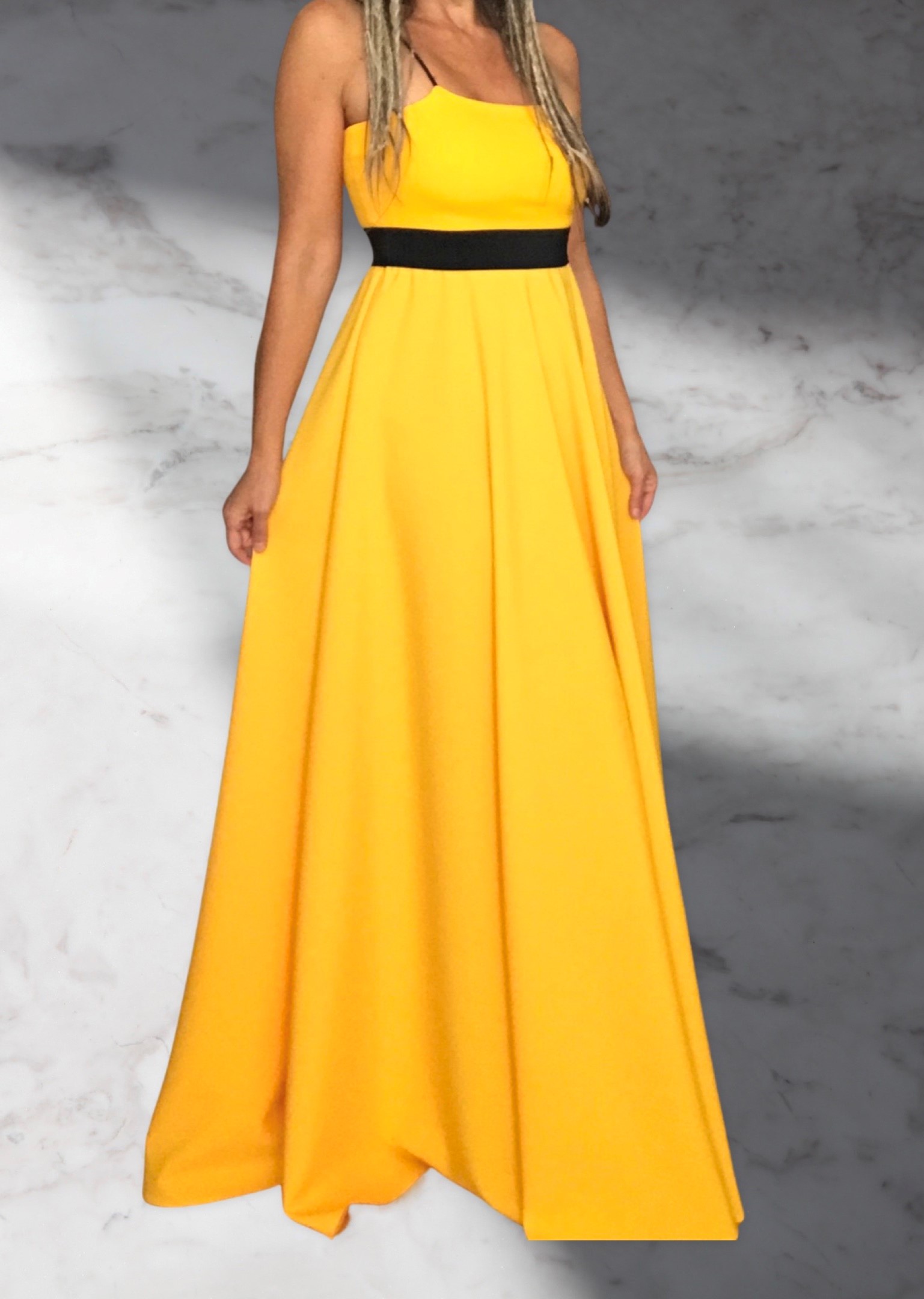DLOUHÉ LETNÍ ŠATY - luxusního vzhledu a nepřehlédnutelné, z lehké kostýmovky ve výrazné žloutkově žluté barvě s pružným topem z úpletu.