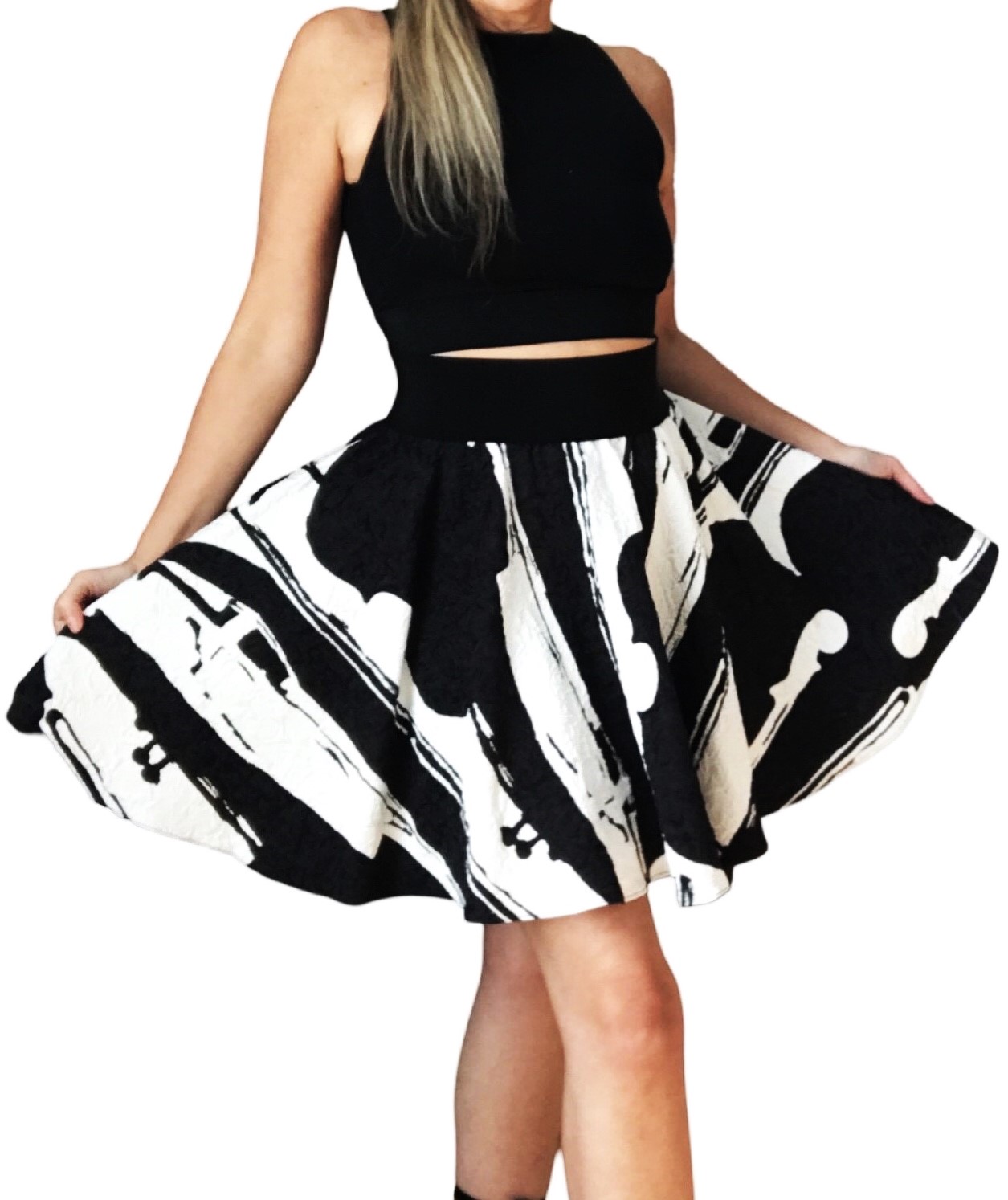 Krátká kolová sukně v černo-bílém provedení s potiskem hudebního motivu - působí spíše jako abstrakt.