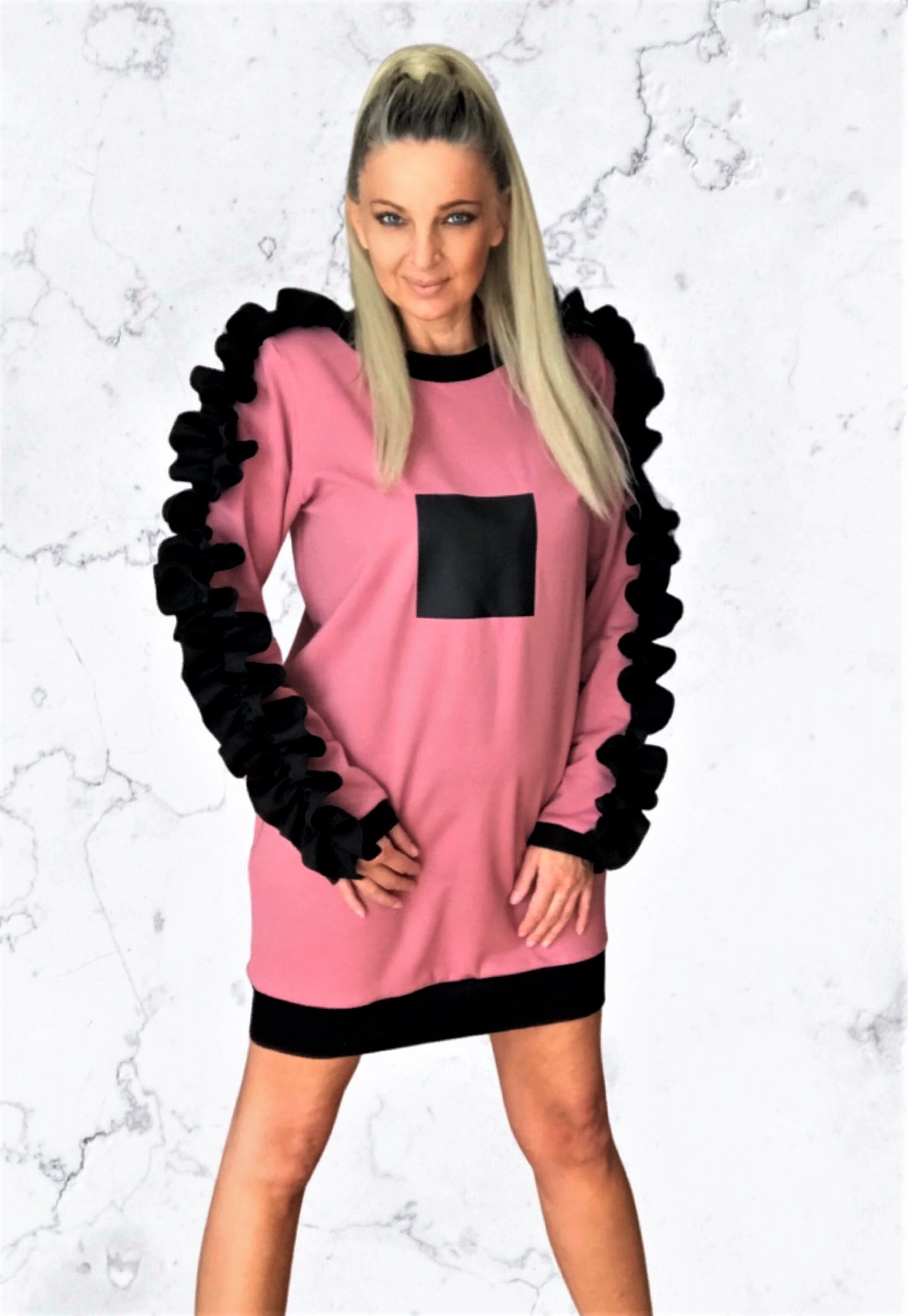 KRÁSNÉ krátké teplákové šaty LUXUSNÍHO VZHLEDU z počesané teplákoviny ve starorůžové barvě kombinaci s černými lemy, černým potiskem a extravagantním volánem. Opravdu NEPŘEHLÉDNUTELNÉ, krásné, působí velmi elegantně i sportovně, záleží s čím je budete kombinovat.